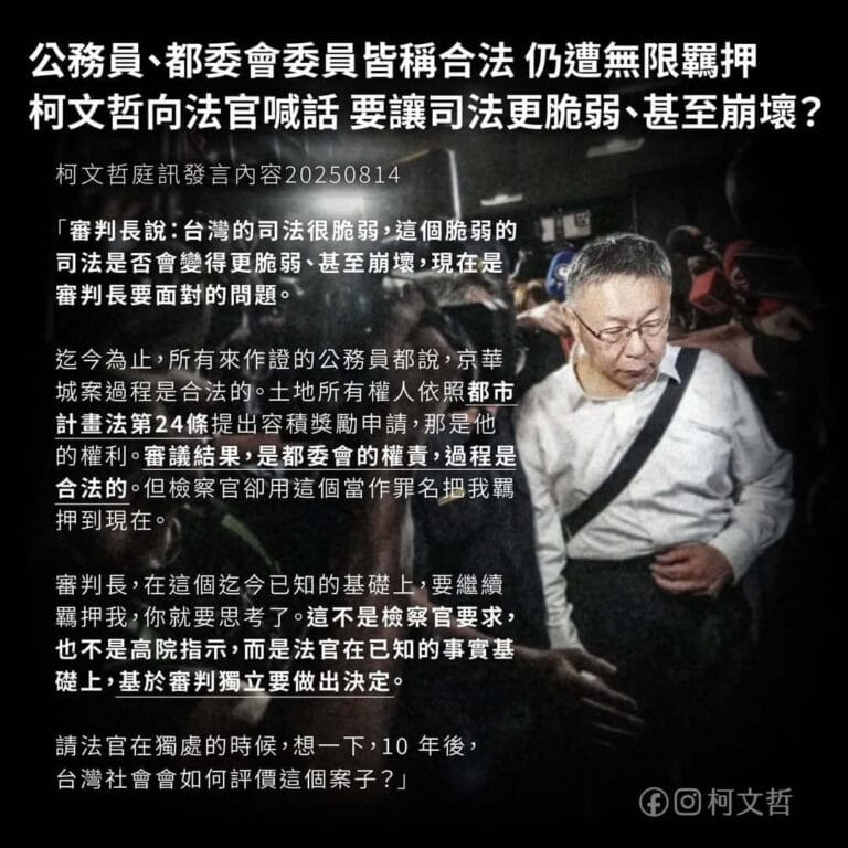 檢察官說我透過市長室秘書去關切京華城案,只要找人來問,就可澄清,我根本沒管這個案子,也不知道進度,當然不可能透過秘書去關切。至於給產業局長的字條,說是施壓,我就文字讀來讀去,實在看不出那個地方施壓,這是因為兩個月公文往返7次沒有結論,這個我真的受不了,所以問他們是否當面討論?本來司法的象徵正義女神,她是把眼睛矇住的,意思是說司法應當是中立的,司法正義才是唯一的目標,現在檢方好像唯一的目標就是把柯文哲定罪,已經不惜使用抹黑影射的手法。