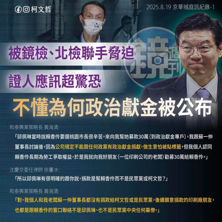 柯文哲今天在北院自白,強調政治獻金是來自支持者的期望,自己絕對沒有侵占的犯意。至於京華城案,自己也絕對沒有明知違法而為之。但是他完全不理解為何彭振聲、邵琇珮兩人都在偵訊過程中斷錄影後不久就認罪了,看不出為何他們會認罪?是認什麼罪?但柯文哲也相信,時間久了,真相會慢慢顯現出來,「我會保持正面的態度面對一切,所有的苦難都會過去,希望台灣越來越好。」